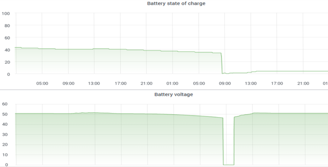 - In der unteren Kurve ist zu erkennen, dass die Batteriespannung gegen 9:00 plötzlich zusammenbricht. Das BMS erkennt jetzt seinen Irrtum – eine Notabschaltung der Batterie ist die Folge.