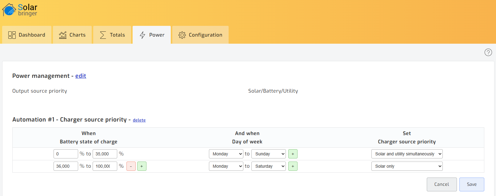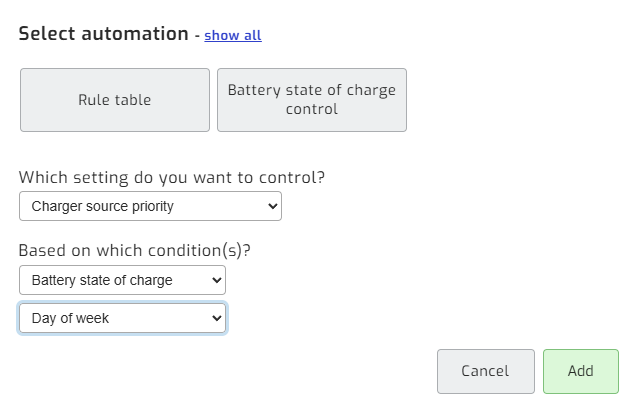 Rufe den Solar-Assistenten auf. Nutze hierfür am besten den PC, um die Regeln komfortabel eingeben zu können. Klicke auf den Reiter „Power“. Füge eine Automatisierung per Klick auf „Add Automation“ hinzu. Klicke dann auf „Rule table“, und selektiere die Auswahlboxen wie im Bild.